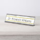 Sie können die Namensplatte mit Ihrem Namen in schwarzem Text anpassen. Ein goldener Rand eines Imitats ist über und unter dem Text auf weißem Marmor-Hintergrund.
