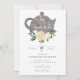 Le teatime de douche nuptiale devient un événement élégant avec des roses blanches et du feuillage vert. Teapot dans un lit d'ivoire et de roses blanches ; mélange de médias aux couleurs taupe, ivoire et vert forêt. Reverse à une texture verte feuillue sous-estimée centrée de roses blanches et d'accents d'or.