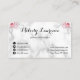 Moderne Visitenkarten für Friseursalons mit Imitaten aus Kupfer-Rose-Goldschere, Rosa und Weiß-Rosen, weißem Marmorboden und elegantem Kalligraphie-Schriftart.