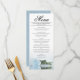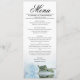 Dieses schöne Menü wird Ihrem Hochzeitsempfang etwas mehr Stil verleihen. Es zeichnet sich durch ein wunderschönes und romantisches Design aus. Die helle, staubblaue Rose des Single spiegelt sich in einem Wasserbecken mit Wellen und Wellen wider. Es gibt Platz für die Namen des Paares und das Hochzeitstag, und der Text ist vollständig anpassbar.
