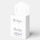 Eine elegante Hochzeitsvorgeschenkbox mit stilvollen lila Signaturskriptnamen und einem besonderen Datum-Set in moderner Typografie. Sie können mit Ihrer eigenen Danksagung unter dem Deckel personalisieren. Ein perfekter Weg, um sich bei Ihren Gästen zu bedanken! Entwickelt von Thisisnotme©