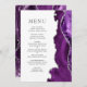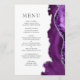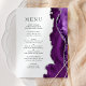 Das elegante, moderne Hochzeitsmenü mit lila Aquarellrahmen und Imitaten mit silberfarbenem Glitzer liegt am rechten Rand. Der individuell anpassbare Text kombiniert kohlegraue römische Serifen und Kupferplatte Schriftart auf weißem Hintergrund. Auf der Rückseite ist ein lila und silberfarbenes Design erkennbar.