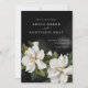 Eine elegante Einladung zur Hochzeit, entworfen mit einer Illustration von White Magnolia auf einem schwarzen Hintergrund. Die Rückseite dieser Karte kann mit Ihrem bevorzugten porträtorientierten Foto angepasst werden. Entsprechende Artikel in unserem Shop Cava Party Design