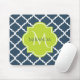 Ein elegantes, blaues Quatrefolienmousepad mit gemustertem Mousepad mit geschmiedetem Abzeichen in einem lebendigen Frühlinggrün, das Sie personalisieren können, indem Sie Ihren Namen und mit Monogramm Erstausstattung hinzufügen. Dies ist Teil der Sailor Blue und Limon Punch Spring Collection.