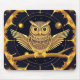 Stilisierte Abbildung einer Nachteule, die auf einem Ast inmitten von goldenen und blauen Mustern steht und ein magisches und mystisches Ambiente hervorruft, das sich ideal für dekorative oder künstlerische Zwecke eignet.