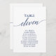 Diese eleganten, blau-marineblauen Tischnummer-11-Sitzkarten eignen sich perfekt für eine einfache Hochzeit. Das neutrale Design besticht durch eine minimalistische Karte, die mit romantischer und skurriler Typografie dekoriert ist. Die Karte druckt auf der Vorder- und Rückseite (beidseitig).