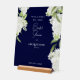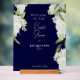 Navy Hintergrund White Hydrangea Brautparty Acryl Begrüßungszeichen. Weiße Schrift. Modernes Design und Schriftart. elegant.