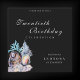 Eine schöne, moderne und elegante Geburtstagseinladung in Schwarz-Weiß mit handbemalten Muscheln und Korallen auf einem Sandstrand. Für jeden Geburtstag individuell einstellbar
