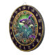 Umgestalten Sie Ihre Angellodge oder Ihre Mancave mit dieser eleganten Dartboard-Dekoration mit Orca und Schildkröten. Die zentrale Figur, ein Orca-Regal, ist schön detailliert mit aufwändigen Designs in lila, gold und blau, was ihr einen auffallenden Buntglaseffekt verleiht. Eine Schildkröte ergänzt das Wassermotiv um ein angenehmes Baden. Die gesamte Komposition wird in einem runden Rahmen mit aufwändigen Goldfiligranen, leuchtenden Edelsteinen und himmlischen Elementen verziert. Dieses einzigartige Stück verbindet rustikalen Charme mit einem fantasievollen Flair und macht es zu einer perfekten Ergänzung zu jedem Erholungsraum. Ideal für Fans von Meereslebewesen, Outdoor-Enthusiasten oder für alle, die eine besondere Wandkunst suchen, passt dieses Dekor nahtlos in eine menschliche Höhle, Lodge oder Spielhalle. Halten Sie dieses Dartboard fest oder zeigen Sie es als Brennpunkt an, um die Atmosphäre Ihres Raumes sofort zu verbessern. Die harmonische Mischung lebendiger Farben und detaillierter Handwerkskunst sorgt dafür, dass jeder Besucher das Auge erblickt. Erschaffen Sie mit diesem einzigartigen Orca- und Schildkrötendesign einen Raum, der Ihre Liebe für Kreativität und Natur widerspiegelt.