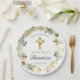 Celebre el bautizo de su hermoso bebé con familiares y amigos mientras ofrece comida con estos bonitos platos de papel de bautismo florales Este krankño presenta una majestuosa cruz de oro adornada con rosas color crema alrededor de los platos de papel para una rezepción de bautismo.
