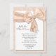 Schöne, maßgeschneiderte Hochzeitseinladung mit einem blassen, pfirsichfarbenen Damast wie Hintergrund. Ein weißer Textebereich mit weißem Lagen und einem satinartigen pfirsichfarbenen Bogen mit Perlenverzierungen wird abgerundet. Personalisieren Sie den gesamten Text, um Ihre Hochzeitsbedürfnisse zu Anzug zu bringen. Matching Produkte verfügbar.