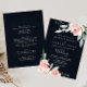 Diese elegante rosa blütenfarbene Vorder- und Rückseite der Hochzeit lädt zu einer einfachen Hochzeit ein. Das Design besteht aus handgezeichnet, rosa, blüten Rose und Pfannkuchen mit grünen und grauen Blätter im dunkelblauen Hintergrund und inspiriere die natürliche Schönheit. Rett Papier, indem man mehr Details auf der Rückseite der Einladung anstatt auf einer separaten Gehäusekarte angibt.