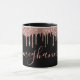 Eleganter, moderner Rosa Rosa Rose Gold Glitzer Tropfen Monogram Script auf schwarzen benutzerdefinierten personalisierten Namen oder mit Monogramm Tasse. Mit einem Imitat Glitzer Tropfrahmen, große handgeschriebene Monogramm Skript kursiven Schriftart mit Swashes (große Größe Vorname) in rot rosa oder Rose goldfarben auf schwarzem Hintergrund. Einfach zu personalisieren. Großes Frauengeschenk für Freundin, Mutter, Geburtstag, Hochzeit, Brautparty, süße 16 Geburtstagsparty und Babydusche, Business, Zuhause Office, berufliche Arbeit und für alle, die hübsche Glam Dinge mögen.