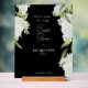 Schwarzer Hintergrund Weißes Hydrangea Brautparty Acryl Begrüßungszeichen. Weiße Schrift. Modernes Design und Schriftart. elegant.
