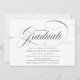 Elegante Abschlussfeier Einladungen mit "Graduate" in einem schwarzen, modernen Kalligrafieschrift. Personalisieren Sie die Einladungen der Schwarz-Weiß-Abschlussfeier, indem Sie den Namen des Absolventen, das Abschluss-Jahr, den Namen der Schule und die Einzelheiten der Abschlussfeier hinzufügen. Die trendy Graduierungsparty lädt zurück zu einem weißen Trellis-Muster mit schwarzem Hintergrund.