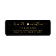 Elegante, moderne Schwarz-Gold-Rücksendeadressen-Aufkleber. Mit einer hübschen handgeschriebenen Schriftzeichen-Braut und dem Vornamen des Bräutigams mit schwarzem Swash-Schwanz-Schriftart, kleine Herzform zwischen den Namen auf weißem Hintergrund. Einfach mit Ihren Namen und Rücksendeadresse-Infos personalisieren.