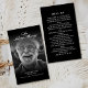 Diese moderne, schwarz-weiße Gebetskarte bietet eine zutiefst persönliche Art, Reflexion und Trost in Zeiten der Erinnerung zu teilen. Diese stilvolle Karte verfügt über ein Foto auf der Vorderseite mit der ikonischen Inschrift "In Loving Memory" in einem eleganten Skript, sowie über den Namen und die Daten, die ein Leben lang rahmen. Im Gegenteil, ein Gedicht, ein Gebet oder ein Zitat bietet Worte des Komforts. Diese Gebetskarte, geeignet für einen Mann oder eine Frau, ist eine passende Begleitung bei Beerdigungen, Gedenkfeiern, Lebensfeiern, Gebetsveranstaltungen oder stillen Reflexionsmomenten auf der Zuhause. Die elegante Schrift und die einfache monochrome Palette ehren das persönliche Gedächtnis und bieten den Trauernden einen spürbaren Komfort. Verteilen Sie diese Gebetskarten an Freunde und Familie als Mittel, um sich zur Unterstützung und gemeinsamen Erinnerung zusammenzufinden und sich dem Trost des Gebets und dem Power der Gemeinschaftsheilung zuzuwenden. Diese Gebetskarte ist ein wunderschöner Ausdruck der Reise des Lebens und des Geistes, der auch in Abwesenheit inspiriere.