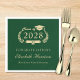 Elegante grüne und goldene Graduiertenservietten mit "Class of" in einem Lorbeerkranz mit Gradmütze und Diplom, den Namen des Absolventen in einem formalen Drehbuch, und "Gratulationen" und ihren Schulnamen in klassischer Typografie.
