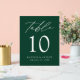 Trendy, minimalistische Hochzeitskarten mit "Tisch" in einem weißen Kalligrafieschrift mit dunkelgrünem Acrylhintergrund. Zum Bestellen des Plastikkartenzeichens: Name, Hochzeitstermin und Tischnummer hinzufügen. Fügen Sie jede Nummer einzeln in Ihren Warenkorb und Karo, wenn Sie fertig sind.