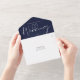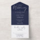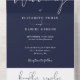 All in einer marineblauen Hochzeitseinladung mit eleganter Schrift-Kalligraphie-Typografie. Die Einladung enthält eine perforierte RSVP-Karte, die für Sie individuell adressiert oder links als leere Karte für die Handschrift der Adressdaten Ihres Gastes verwendet werden kann. Entwickelt von Thisisnotme©