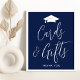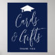 Modernes Partyzeichen mit einer Abbildung eines weißen Graduierungskappens oben mit "Karten und Geschenke" in einem weißen Kalligrafieschrift auf marinischem Hintergrund (oder einer Farbe Ihrer Wahl). Personalisieren Sie das einfache Abschluss Poster mit Ihrem eigenen Text am unteren Rand (derzeit mit "Danke" angezeigt). Das Partyschild für Seefahrer ist sowohl für Absolventen der Highschool als auch für Absolventen der Uni ideal.