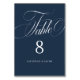 Die elegante Script Navy Blue Wedding Tischnummer verfügt über ein großes, feines Skript und ein elegantes Styling.