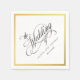 Eine wunderschön elegante Hochzeitsserviette mit kalligrafischem Schriftzeichen-Akzent mit einer breiten Goldgrenze, die Ihren Text umgibt. Der schlichte, geschmackvolle Stil ist für Hochzeiten zu jeder Jahreszeit gut geeignet.