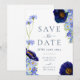 Schöne handbemalte Aquarellblumen mit blauen, staubblauen, marineblauen, blauen, blauen, lila, grünen und gelben Wildblumen speichern die Dattelkarte. Blume inklusive Kosmos, Maisblumen, Mohn und vergessen Sie mich nicht mit Blattwerk. Einfach zu bedienende Vorlage mit modernen romantischen Typografie-Skripten. Ideal für eine einmalige botanische Seefahrt blauen Themen Sommer oder Frühling Hochzeit. Einzigartiges Originalwerk von Catherine Sweetman