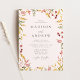 Elegante Wildblume Hochzeitseinladungen mit Namen und Hochzeitsdetails in grüner Schrift, umgeben von Aquarellfarben-Blume und Blattwerk in goldgelben, rosa und lila Farbtönen. Die Aquarelleinladungen eignen sich hervorragend für Hochzeiten im Frühjahr und Sommer.