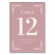 Diese elegante Hochzeitstischkarte hat einen weichen rosa Hintergrund mit einer zentrierten, fetten Zahl "12" in weißer Serifenschrift. Das Design enthält dekorative Schnörkel, die stilisierten Zweigen an jeder Ecke ähneln und einen Hauch von Raffinesse verleihen. Anpassbare Textfelder ermöglichen eine Personalisierung mit Namen und Daten, was sie perfekt für ein formelles Ereignis macht. Das Gesamtlayout ist ausgewogen und harmonisch und vermittelt einen verfeinerten und einladenden Ton, der ideal ist, um besondere Momente zu feiern.
