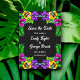 Diese elegante tropische Hochzeit speichern Sie die Dattelinie ist perfekt für eine moderne Sommerhochzeit. Das schlichte Design zeichnet sich durch gelbe, lila und rosafarbene Blume mit eleganter weißer Typografie auf fett schwarzem Hintergrund aus.