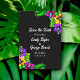Diese elegante tropische Hochzeit speichern Sie die Dattelinie ist perfekt für eine moderne Sommerhochzeit. Das schlichte Design zeichnet sich durch gelbe, lila und rosafarbene Blume mit eleganter weißer Typografie auf fett schwarzem Hintergrund aus.