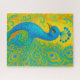 Dieses elegante Puzzle-Natur-Puzzle wird Ihnen viele Stunden Spaß machen. Der Vogel ist türkisblau, grün und blau auf einem gelben gemusterten Hintergrund. Bild generiert mit KI.