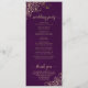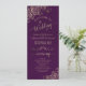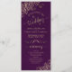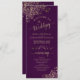 Dieses wunderschöne Hochzeitsprogramm besticht durch ein elegantes Design mit Goldtext auf einem lila Pflaumenboden und glänzenden goldenen Imitaten und Wirbel in den Ecken. Die Titel sind in extravaganter Schrift-Kalligraphie geschrieben, und es gibt Platz für Ihre Zeremonie und Hochzeitsfeier Details, sowie ein kurzes Dankeschön für Ihre Gäste. Ein wunderbarer Weg, um Ihre Freunde und Familie zu Ihrer Hochzeitsfeier zu begrüßen.