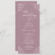 Diese eleganten hellvioletten Hochzeitsprogramme verfügen über einen verzierten dekorativen Rahmen mit moderner Kalligraphie. Dieses Lilve ist eine lila rosa oder staubige Rose. Diese Teezeit-Programme sind flach mit Vorder- und Rückseite. Ihre Hochzeitsfeier und Dankeschön-Nachricht ist auf der Rückseite. Sehen Sie sich passende Stücke in dieser lila Hochzeitskollektion an.