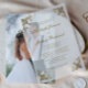 Diese elegante Vintag-inspirierte formale Vellum Hochzeitseinladung enthält goldfarbene Schrift- und Serifenschrift-Schriftart, gerahmt von verzierten dekorativen Goldmotiven in allen vier Ecken. (Das Foto-Kartenunterlage wird separat verkauft; siehe Sammlung unten.)
