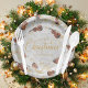Diese musikalischen Weihnachtszeitschriften-Teller sind mit einem Muster-Violinen verwoben, die mit goldenen Farbbändern von Notenblättern auf einer subtilen marmorfarbenen Hintergrundtextur verziert sind, mit elegantem Drehbuch Frohe Weihnachten und einer Personalisierungsvorlage für Ihren Namen oder andere Texte.