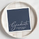 Elegant blaue Graduiertennapkins mit "Graduate" in einem schicken weißen Drehbuch und dem Namen und der Klasse Jahr des Absolventen in einfachem, modernem, weißem Schriftsatz.