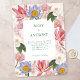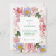 Diese bezaubernde, handbemalte Hochzeitseinladung umschließt das Thema Wildblume mit einem lebendigen Rahmen verschiedener Blüten. Pinke, Weiße und blaue Purpare dominieren die Blumenstruktur, Set vor einem weichen rosa Hintergrund. Elegantes grünes Skript auf der weißen Mittelplatte fügt eine klassische, natürliche Touch hinzu.