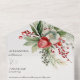 Diese All-in-One-Hochzeitseinladung ist dazu gedacht, die bezaubernde Essenz des Winters mit eleganten Sträuchern aus Blume, Beeren und Kiefern zu verkörpern, die die Romantik Ihrer Liebe mit dem Charme der Wintersaison wunderbar vereinen. Die All-in-One Hochzeitseinladungen sind schön und praktisch, indem sie die Hochzeitseinladung mit einer leicht zu entfernenden perforierten UAWG-Postkarte kombinieren. Sie sind auch schnell und einfach für den Versand vorbereitet. Einfach auf die Einladung richten, die Rückenklappe und das Siegel mit den beiliegenden Klarsichtstickern falten. Sobald Ihre Gäste die voradressierte Einladung erhalten, reißen sie einfach die perforierte RSVP-Karte ab und lassen sie in der E-Mail ablegen.