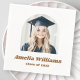 Weiße Abschluss-Servietten mit Ihrem Foto in einem Bogen-Rahmen und dem Namen des Absolventen in einem kühlen, Retro-Stil Schriftart. Sie können Hintergrund, Schriftart und Schriftart ändern, Elemente verschieben und verändern.