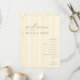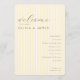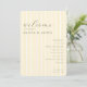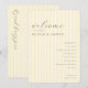 Dieses elegante Hochzeitsprogramm verfügt über ein minimalistisches Design mit einem hellbeigen Hintergrund und dezenten diagonalen Streifen. Das Layout ist vertikal strukturiert und zeigt das Wort "Willkommen" in einer eleganten Schreibschrift oben, gefolgt von den Namen des Paares in fetter Großschrift. Eine saubere serifenlose Schrift listet den Ablauf der Zeremonie auf der rechten Seite auf und sorgt für Klarheit und Organisation. Die neutrale Farbpalette schafft eine ruhige und einladende Atmosphäre, die perfekt für eine formelle Veranstaltung ist. Ideal für Paare, die dezente Raffinesse suchen, kombiniert dieses Programm Einfachheit mit raffinierter Typografie, um den Ton für ihren besonderen Tag zu setzen.