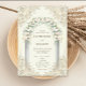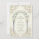 Eine romantische Hochzeitseinladung mit einem zarten Blumenbogen mit sanften rosa Rosen und goldenen botanischen Details. Das elegante Vintage Design schafft einen zeitlosen Look, der sich perfekt für klassische Hochzeiten und feierliche Feste eignet.