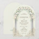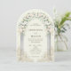 Eine romantische Hochzeitseinladung mit einem zarten Blumenbogen mit sanften rosa Rosen und goldenen botanischen Details. Das elegante Vintage Design schafft einen zeitlosen Look, der sich perfekt für klassische Hochzeiten und feierliche Feste eignet.