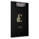 Die elegante schwarze Zwischenablage verfügt über ein goldenes botanisches Monogramm in der Mitte.