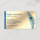 Elegante Pfauendesign-Visitenkarte mit einem schönen Pfau mit lebhaften Federn und moderner Typografie auf einem Imitat mit Goldfolie-Hintergrund. Fügen Sie Ihren Namen und Ihre Kontaktdaten hinzu, um einen bleibenden ersten Eindruck zu machen.