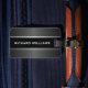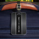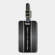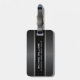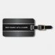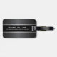 Stilvolle Gepäckmarke mit Ihrem Namen in Weiß auf einem schwarzen Hintergrund mit dunkelgrauen Gradientengrenzen oben und unten. Adresse auf der Rückseite.