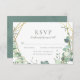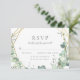 Matching RSVP Karten für unsere Einladung "Elegant Eukalyptus & Gold Geometric Frame Wedding". Eukalyptus foliage ist der ideale Begleiter, um einer Stallhochzeit eine rustikale Touch zu verleihen oder einen natürlichen Look für Ihren großen Tag zu schaffen! Ein elegantes Gartendesign mit einem geometrischen Rahmen, handgemalten Eukalyptus-Blätter, Imitaten mit Goldrahmen und Schriftzeichen. Diese Karten kehren zu einem Bild eines schlauen grünen Aquarellspülens um.