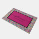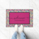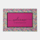 Elegante Begrüßung Doormat mit einem schwarzen Drehbuch auf einem rosa Hintergrund, geschmückt mit einem farbenfrohen Zickzack Rahmen. Personalisieren Sie Ihre Daten mit Ihrem Familiennamen oder Text.