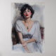 Dieses faszinierende Aquarellportrait strahlt eine Atmosphäre von ausgeklügelter Anziehungskraft und selbstbewusstem Glamour aus. Eine wunderschöne junge Frau mit auffallendem dunklem Haar wird dargestellt, ihre Augen blicken faszinierend auf sie links. Sie trägt ein elegantes, hellgraues Kleid mit einem verführerischen, tiefen Ausschnitt, perfekt ergänzt durch einen fett hellroten Lippenstift, der ihren schwülen Ausdruck unterstreicht. Die fließende Aquarelltechnik verstärkt die Weichheit der Szene, das subtile Lichtspiel und ihre bezaubernde Präsenz. Dieses Stück feiert selbstbewusste Weiblichkeit, zeitlosen Glamour und unterdrücktes Drama.